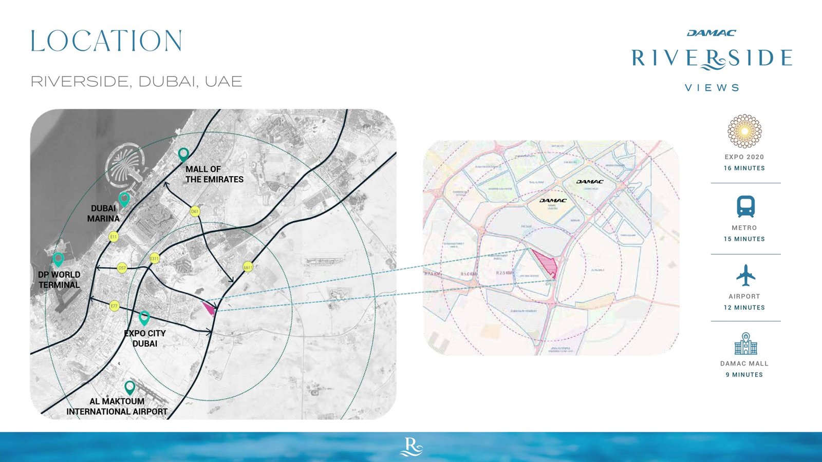 Damac Riverside Views Apartments 位於杜拜投資園區二號 (Dubai Investment Park 2) 的黃金地段,為住戶提供無與倫比的便利交通和卓越的生活品質。距離阿聯酋路 (Emirates Road) 和亞拉伊斯街 (Yalayis Street) 等主要高速公路僅數分鐘車程,方便前往杜拜市中心 (Downtown Dubai)、杜拜碼頭 (Dubai Marina) 和杜拜國際機場 (Dubai International Airport) 等主要目的地。